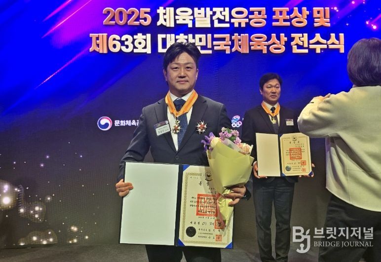 브릿지저널 정보영 기자 | 경주시청 우슈팀 우승수 감독이 21일 서울에서 열린 ‘2025 체육발전유공 포상 및 제63회 대한민국체육상 전수식’에서 체육훈장 맹호장을 받았다.
