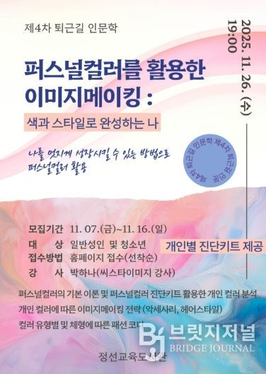 브릿지저널 윤나영 기자 | 정선교육도서관은 11월 26일, 고등학생과 일반 성인을 대상으로 제3차 퇴근길 인문학 “퍼스널컬러를 활용한 이미지메이킹 : 색과 스타일로 완성하는 나” 강연을 운영한다.