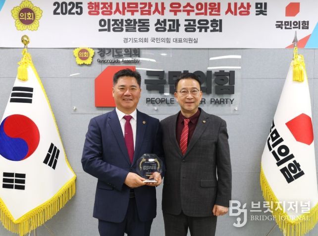 브릿지저널 김경미 기자 | 경기도의회 경제노동위원회 정하용 의원(국민의힘, 용인5)은 24일, 국민의힘 회의실에서 열린 ‘2025년 행정사무감사 우수의원 시상식’에서 행정사무감사 우수위원으로 선정됐다. 이번 선정은 행정사무감사 기간 동안 도민생활과 직결된 핵심 현안들을 면밀히 점검하고, 구조적 문제를 드러내는 데 기여한 점이 높게 평가된 결과이다.