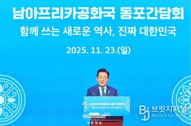 브릿지저널 김경미 기자 | 주요 20개국(G20) 정상회의 참석을 위해 남아프리카공화국을 방문한 이재명 대통령은 23일(현지시간) 양국 수교 후 최초로 동포간담회를 개최해 현지에 거주하는 동포들을 격려했다.