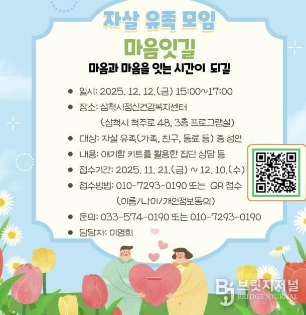 브릿지저널 윤나영 기자 | 삼척시정신건강복지센터는 오는 12월 12일에 올해 마지막 ‘2025년 자살 유족 모임’을 진행한다고 밝혔다. 올해 네 번째로 열리는 정기 모임으로, ‘얘기함 키트’를 활용한 프로그램이 센터 내에서 운영될 예정이다.