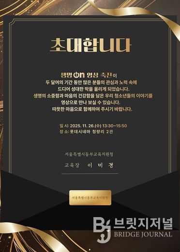 브릿지저널 김경미 기자 | 서울특별시교육청 산하 서울특별시동부교육지원청은 오는 11월 26일 13시 30분, 청량리 롯데시네마에서 청소년 생명존중・자살예방 영상 축제인 '생명ON 영상축전'을 개최한다.