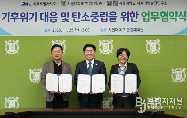제주도는 25일 오전 서울대학교에서 서울대 환경대학원, 지속가능발전연구소와 ‘기후위기 대응 및 탄소중립을 위한 지속가능 정책 연구·자문 및 교류 업무협약’을 체결했다.