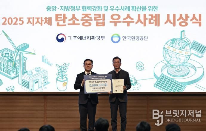 브릿지저널 김경미 기자 | 서울 은평구는 지난 17일 ‘2025 지자체 탄소중립 콘퍼런스’에서 탄소중립 이행성과 부문 우수기관으로 선정되어 한국환경공단 이사장상을 받았다고 밝혔다.