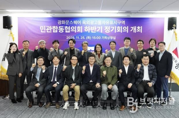 브릿지저널 김경미 기자 | 종로구는 11월 25일 구청 기획상황실에서 ‘광화문스퀘어 옥외광고물 자유표시구역 민관합동협의회’ 하반기 정기회의를 열고, 2025년 성과를 점검하는 한편 2026년 광화문스퀘어의 완성을 위한 사업계획을 논의했다.