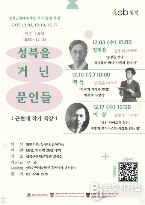 브릿지저널 김경미 기자 | 성북구가 지역과 문학의 연계를 강화하고 시민들이 성북의 문학적 자산을 더욱 가까이 만나볼 수 있도록, 지역-문인 특강 '성북을 거닌 문인들 : 근현대 작가 특강'을 성북근현대문학관에서 개최한다.