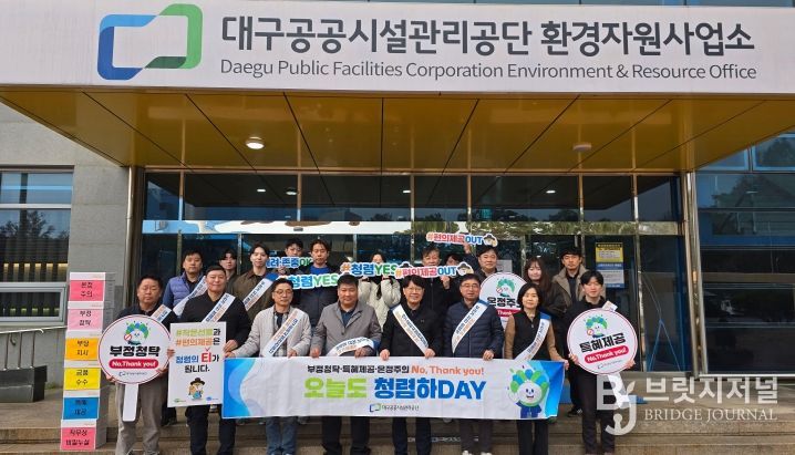 브릿지저널 김진석 기자 | 대구공공시설관리공단 환경자원사업소는 11월 25일, 청렴문화 확산과 지역사회 청렴도 향상을 위해 ‘청렴하DAY’ 협동캠페인을 진행했다.