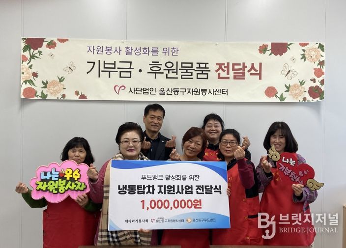 브릿지저널 윤나영 기자 | 해바라기봉사회(회장 김광희)는 11월 26일 사단법인 울산동구자원봉사센터(이사장 이순자) 소회의실에서 동구지역 자원봉사 활성화를 위한 기부금 100만원을 전달했다.
