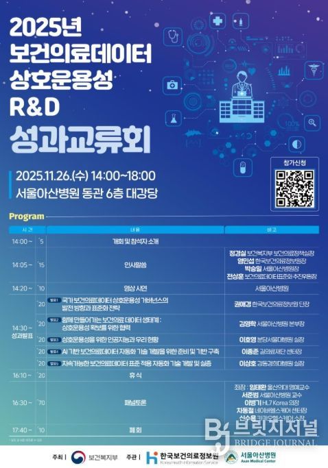 브릿지저널 김경미 기자 | 보건복지부가 주최하고 한국보건의료정보원(원장 염민섭)이 주관하는 '보건의료데이터 상호운용성 R&D 성과교류회'가 11월 26일 서울아산병원(서울 송파구 소재) 대강당에서 개최됐다.