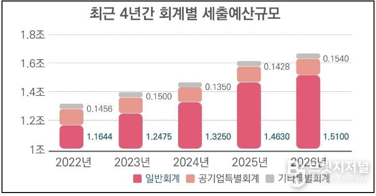 회계별 세출예산 규모를 살펴보면 일반회계는 1조 1,644억 원에서 1조 5,100억 원으로 3,456억 원(29.7%) 늘어났고, 특별회계는 1,456억 원에서 1,540억 원으로 84억 원(5.8%) 증가했다.