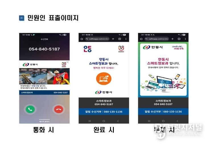 브릿지저널 정보영 기자 | 안동시는 행정전화로 민원인에게 전화할 때 민원인 스마트폰 화면에 시청 이미지와 함께 부서명과 전화번호를 표시해 주는 ‘스마트레터링 서비스’를 오는 12월 1일부터 전면 시행한다고 밝혔다.