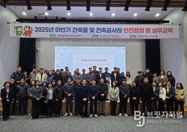 브릿지저널 윤나영 기자 | 강원특별자치도는 최근 전국적으로 건축현장에서 중대재해 사고가 잇따라 발생함에 따라 건축분야 안전점검 실무자의 전문성과 현장 대응능력 강화를 위해 11월 26일 강원연구원 리버티홀에서 '건축물 및 건축공사장 등 안전점검 실무교육'을 실시했다고 밝혔다.