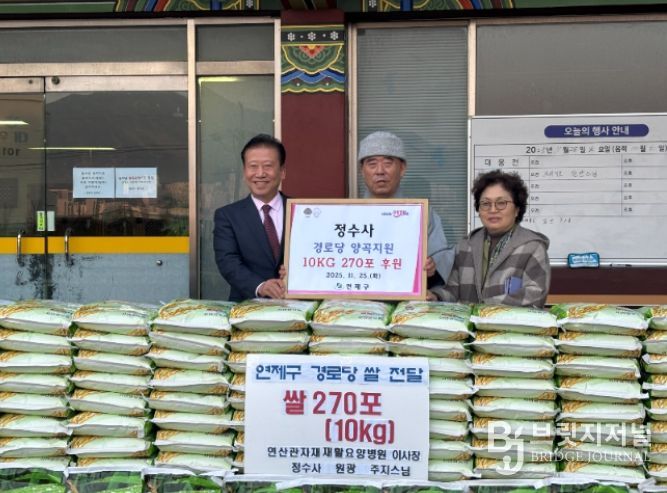 브릿지저널 윤나영 기자 | 연제구는 11월 25일 정수사(주지 원광스님)로부터 관내 경로당을 위한 양곡 10kg 270포를 기탁 받았다.