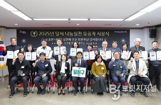 브릿지저널 김진석 기자 | 대구 달서구는 지난 26일 달서구청에서 지역의 어려운 이웃을 위해 꾸준한 나눔을 실천해 온 기업·단체 및 개인 유공자들에게 감사의 뜻을 전하는 ‘2025년 나눔실천 유공자 시상식’을 개최했다.