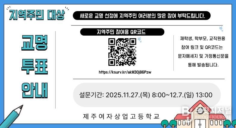 브릿지저널 정보영 기자 | 제주도교육청 제주여자상업고등학교는 2027학년도 일반고(남녀공학) 전환에 따라 실시한 학교명 공모 결과를 심사해 최종 3개 후보를 선정하고 이에 대한 온라인 설문조사를 27일부터 내달 7일까지 진행한다.