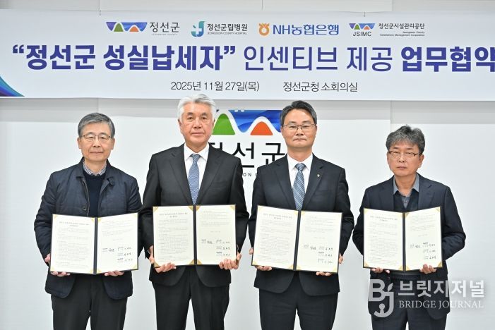 브릿지저널 윤나영 기자 | 정선군은 11월 27일 군청 소회의실에서 성실한 납세 문화 정착과 군민의 납세 의식 제고를 위해 정선군립병원, NH농협은행 정선군지부, 정선군시설관리공단과‘정선군 성실납세자 지원 업무협약’을 체결했다.