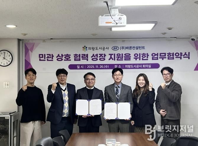 브릿지저널 김경미 기자 | 의왕도시공사가 ㈜바론컨설턴트와 11월 26일, 공사 사옥 회의실에서 혁신과 성장 지원을 위한 업무협약을 체결했다.