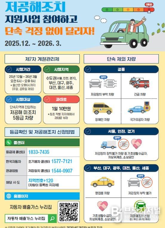 브릿지저널 김진석 기자 | 대구광역시는 12월 1일부터 내년 3월 말까지 4개월간 ‘제7차 미세먼지 계절관리제’ 시행에 따라 배출가스 5등급 차량에 대한 운행제한을 실시한다.