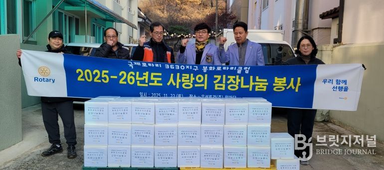 브릿지저널 정보영 기자 | 봉화로타리클럽(회장 원준석)은 11월 25일 (사)봉화군종합자원봉사센터(이사장 김병남)에 김장김치 50박스(150kg)을 전달했다. 이번 기탁은 겨울철을 앞두고 지역 내 취약계층과 소외이웃을 지원하기 위하여 마련됐다.