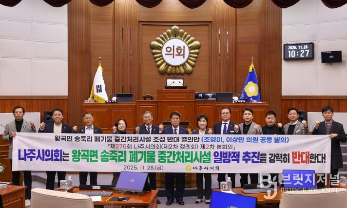 브릿지저널 김경미 기자 | 나주시의회는 28일 제275회 나주시의회(제2차 정례회) 제2차 본회의를 열고 ‘왕곡면 송죽리 폐기물 중간처리시설 조성 반대 결의안’을 채택했다.
