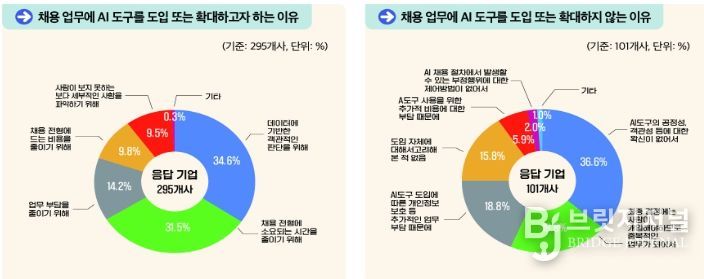 채용 업무에 AI 도구를 도입하거나 사용을 확대하고자 하는 이유로는 ‘데이터에 기반한 객관적인 판단을 위해’(34.6%), ‘채용 전형에 소요되는 시간을 줄이기 위해’(31.5%), ‘업무 부담을 줄이기 위해’(14.2%) 순으로 나타났다.