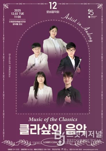 브릿지저널 정보영 기자 | 안동문화예술의전당은 지역예술인들에게 다양한 무대 경험을 제공하고, 시민에게는 일상 속 음악 향유할 수 있는 기회를 마련하고자, 매월 첫째 주 화요일 오전 11시에 로비음악회 시리즈를 진행하고 있다. 올해 마지막 로비음악회는 ‘클라샵’의 공연으로 12월 2일 오전 11시, 웅부홀 로비에서 '클라샾의 음악'이라는 제목으로 개최된다.