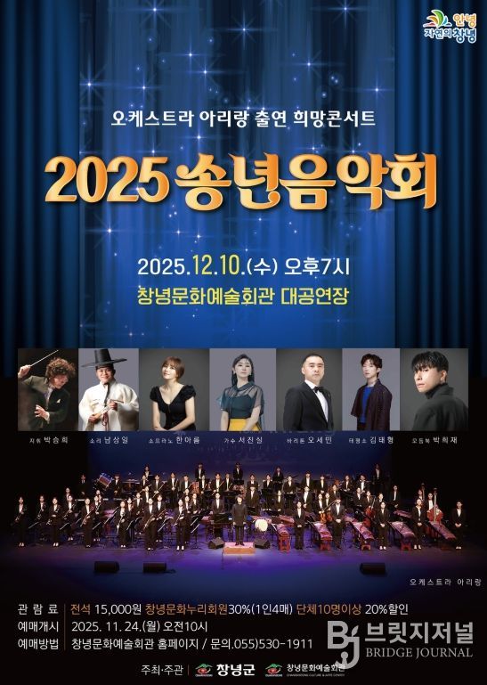 브릿지저널 김경미 기자 | 창녕군은 오는 10일 창녕문화예술회관 대공연장에서 ‘2025 송년음악회 – 오케스트라 아리랑 희망콘서트’를 개최한다고 밝혔다.