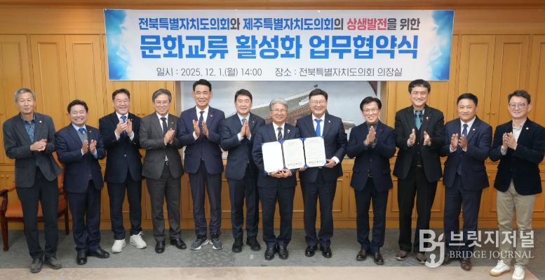 브릿지저널 윤나영 기자 | 전북특별자치도의회와 제주특별자치도의회는 문화·관광·세계유산 분야 협력을 강화하기 위해 1일 전북도의회 의장실에서 문화교류 활성화 업무협약(MOU)을 체결했다.