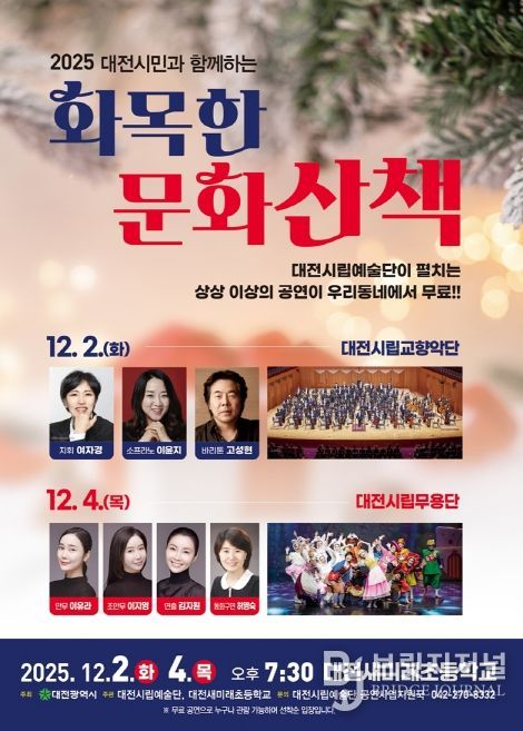 대전시립예술단 관계자는 “가족, 이웃과 함께 즐길 수 있는 ‘화목한 문화산책’을 통해 일상의 순간이 예술로 특별해지길 바란다”라며 “올해의 마지막 공연인 만큼 많은 주민이 찾아오셔서 따뜻하고 풍성한 연말 추억을 만들어 가시길 바란다”라고 전했다.