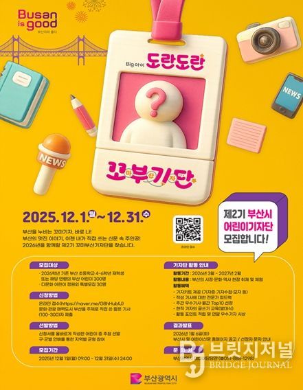 브릿지저널 윤나영 기자 | 부산시는 어린이들이 직접 지역의 다양한 소식을 취재하고 기사를 작성하는 '제2기 부산시 어린이기자단(꼬마부산기자단, 꼬부기단)'을 오는 12월 31일까지 모집한다고 밝혔다.