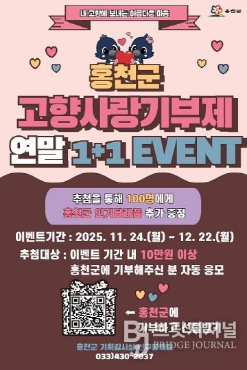 한편, 홍천군은 현재 ‘고향사랑기부제 1+1 이벤트’도 함께 추진하고 있다. 11월 24일부터 12월 22일까지 홍천군에 10만 원 이상 기부하면, 100명을 추첨해 홍천군 인기 답례품을 추가로 증정하는 행사다.