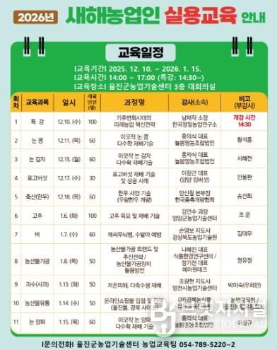 브릿지저널 정보영 기자 | 울진군은 오는 12월 10일부터 2026년 1월 15일까지 총 11회에 걸쳐 ‘2026년 새해농업인실용교육’을 운영한다.
