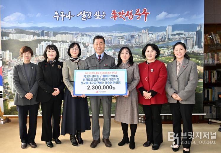 브릿지저널 윤나영 기자 | 국공립 번영로센트리지 4단지어린이집과 옥교어린이집, 뜰에어린이집, 한국에너지공단 에너지숲어린이집이 12월 3일 오전 11시 중구청 구청장실을 찾아 울산사회복지공동모금회를 통해 이웃돕기 후원금 230만 원을 전달했다.