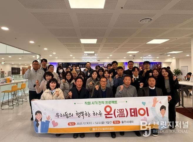 브릿지저널 윤나영 기자 | 울주군시설관리공단은 오는 12월 3일부터 5일까지 3일간 전 직원을 대상으로 한 ‘우리들의 행복한 하루'온(溫) 데이'’프로그램을 운영한다고 밝혔다.