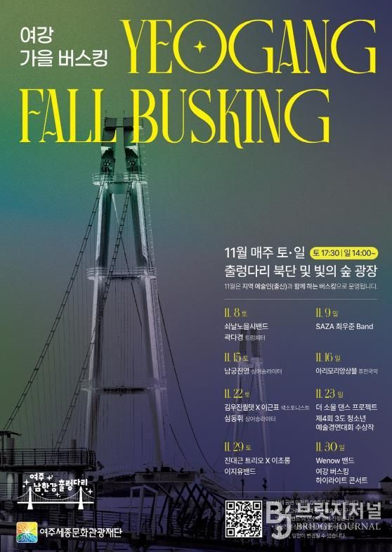 브릿지저널 김경미 기자 | 여주세종문화관광재단은 9월부터 11월까지 가을 시즌을 맞아 여주 남한강 출렁다리 일원에서 운영한 '여강 폴 나잇 버스킹'이 시민과 관광객들의 큰 호응 속에 성황리에 마무리됐다고 밝혔다.