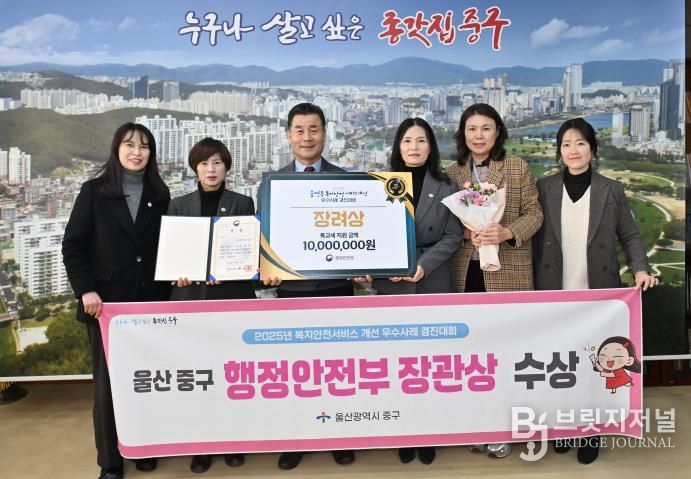 브릿지저널 윤나영 기자 | 울산 중구가 행정안전부 주관으로 지난 12월 3일 정부세종청사에서 열린 ‘2025년 읍면동 복지안전서비스 개선 우수사례 경진대회’에서 복지사각지대 발굴 지원 분야 장려상(행정안전부 장관상)을 받았다.