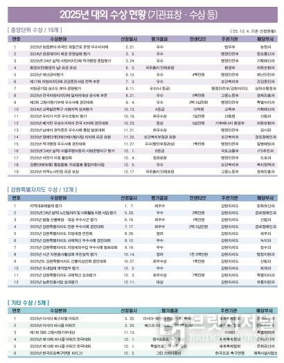 김홍규 강릉시장은 “2025년 수상 실적은 시민 중심 행정이 만든 성과이며, 강원제일 행복강릉 실현을 위해 앞으로도 5대 시정목표를 중심으로 경제, 관광, 문화·예술·교육, 농어업, 복지 등 모든 분야에서 지속적인 혁신을 이어나가겠다.”고 말했다.