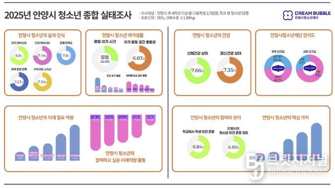 브릿지저널 김경미 기자 | 안양시청소년재단은 5일 관내 초등학교 4학년부터 고등학교 3학년까지 재학 중인 청소년 2,782명과 학교 밖 청소년 53명을 대상으로 실시한 ‘2025년 안양시 청소년 종합 실태조사’ 결과를 발표했다.