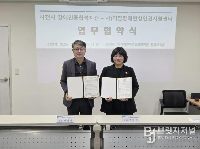 브릿지저널 김경미 기자 | 사천시 장애인종합복지관은 지난 4일 사)디딤장애인성인권지원센터와 발달장애인의 성인권 보호와 권리증진을 위한 업무협약(MOU)을 체결했다.