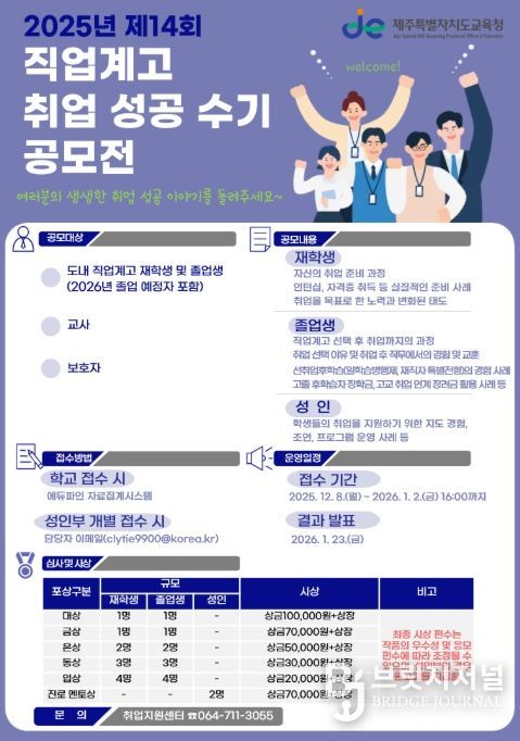 브릿지저널 정보영 기자 | 제주특별자치도교육청은 고졸 취업 성공 문화를 확산하고 직업계고에 대한 긍정적 인식을 높이기 위해‘제14회 직업계고 취업 성공 수기 공모전’을 8일부터 내년 1월 2일까지 개최한다.