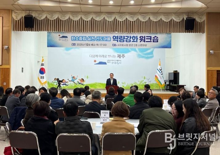 브릿지저널 정보영 기자 | 서귀포시는 4일 서귀포시청 본관 2층 너른마당에서 탄소중립 실천 선도마을(6개마을) 이끄미 등 100여 명을 대상으로 탄소중립 실천 선도마을 역량강화 워크숍을 개최했다.