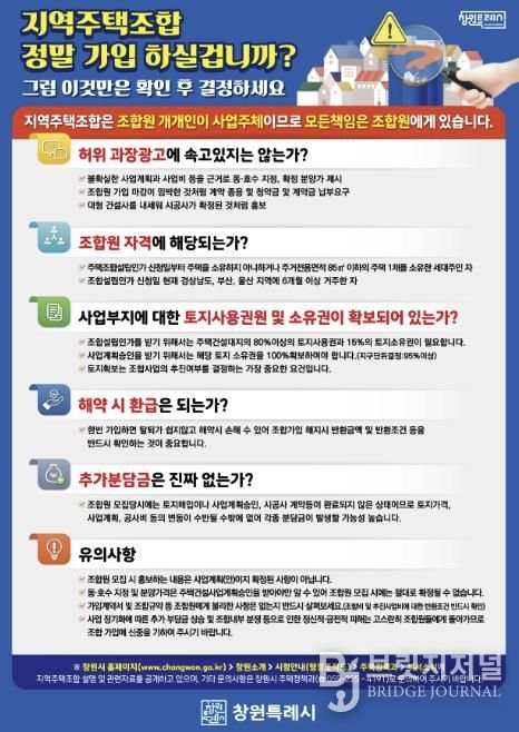 브릿지저널 김경미 기자 | 창원특례시는 지역주택조합 사업과 관련하여 최근 피해 민원이 발생하고 있으며, 이러한 피해는 주로 민‧형사상 고소, 고발 및 소송 등으로 이어져 재산 피해뿐만 아니라 정신적 피해까지 입는 경우가 다수이므로 가입 시 각별한 신중을 기할 것을 시민들에게 당부했다.