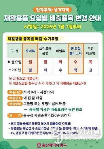 브릿지저널 윤나영 기자 | 울산 동구가 2026년 1월 1일부터 월요일, 목요일의 재활용품 수거 품목을 변경 시행한다고 밝혔다.