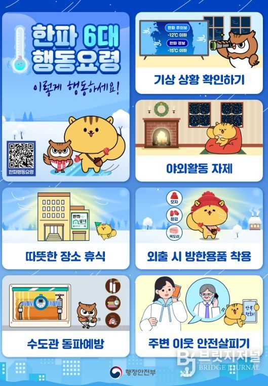 겨울철 한파 대비 국민행동요령은 △기상 상황 확인하기 △야외활동 자제 △따뜻한 장소 휴식 △외출 시 방한용품 착용 △수도관 동파예방 △주변 이웃 안전살피기 등이다.