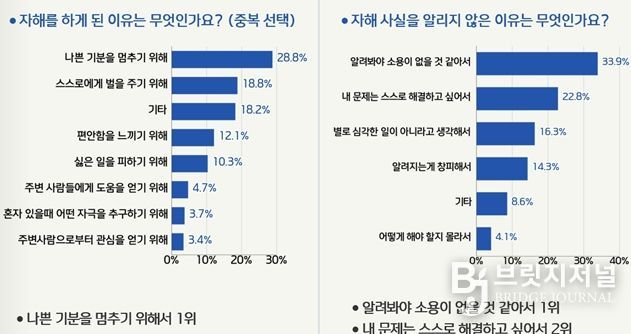 청소년 자해 및 자살 관한 실태조사 결과 응답자의 14%가 자해 사고 경험이 있으며, 그중 7.2%가 실제 자해를 시도한 것으로 나타났다.
