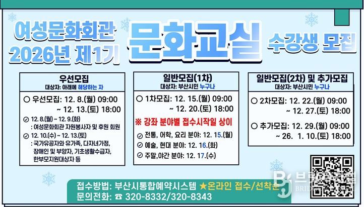 브릿지저널 윤나영 기자 | 부산시 여성문화회관은 오는 내일(8일)부터 '2026년 제1기 문화교실' 수강생을 모집한다고 밝혔다.