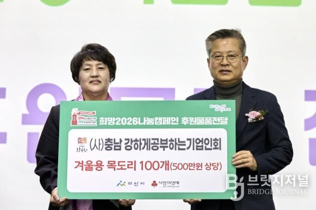 브릿지저널 정보영 기자 | 아산시는 4일 디바인밸리에서 열린 ‘2025년 혁신과 성장으로 여는 기업인대회’에서 (사)충남 강하게 공부하는 기업인회로부터 겨울철 취약계층을 위한 목도리 100개를 기부받았다고 밝혔다.