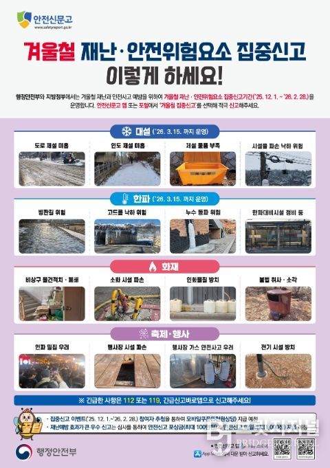 양수호 안전총괄과장은 “시민 한 분 한 분이 주변의 눈길·빙판, 한파·화재 위험 등을 세심하게 살펴 신고해 주신다면 보다 안전한 겨울을 함께 만들어 갈 수 있을 것”이라며, 적극적인 참여를 당부했다.