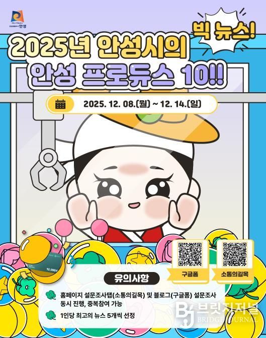 브릿지저널 김경미 기자 | 안성시는 8일부터 14일까지 7일간 ‘2025년을 빛낸 안성시 10대 뉴스’ 선정을 위한 온·오프라인 시민 투표를 진행한다고 밝혔다.