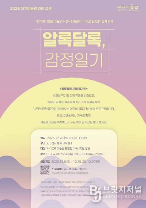브릿지저널 김진석 기자 | 대구문화예술진흥원 대구미술관은 12월 20일 오전 10시 30분, 어린이·가족 대상 전시 연계 교육 ‘알록달록, 감정 일기’를 운영한다.
